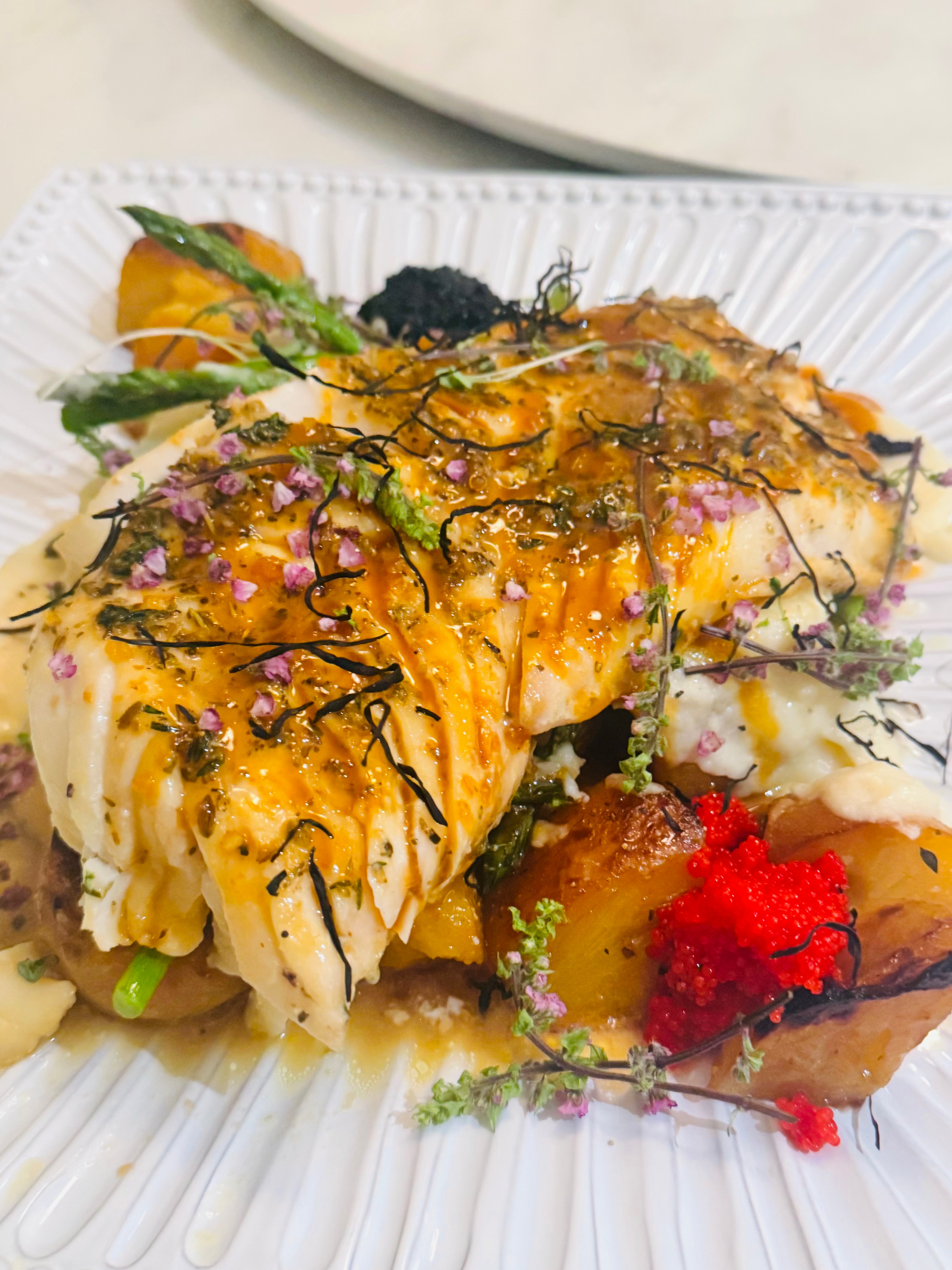 Scallops & Prawns with Pineapple, Lime & Crispy Seaweed Seared scallops and Argentinian line-caught prawns dressed with pineapple, lime, and lemon, Serrano chili, jalapeño, and sumac. Finished with crispy seaweed for texture.