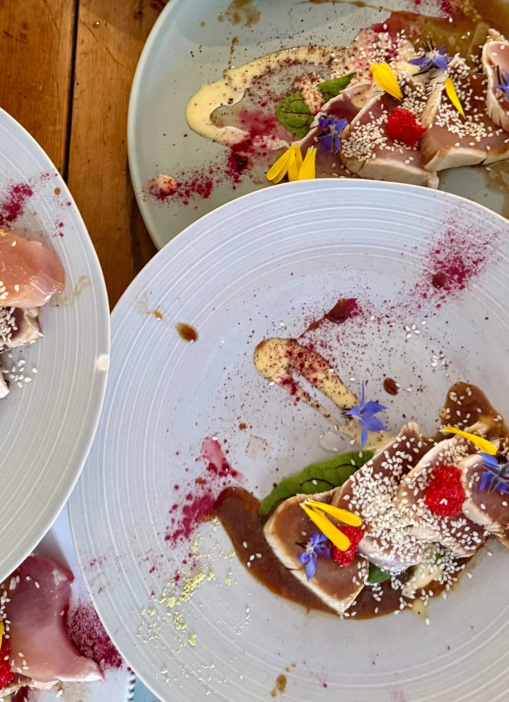 Albacore Tuna Tataki with grapefruit, orange, lime and yuzu, micro-flowers.
